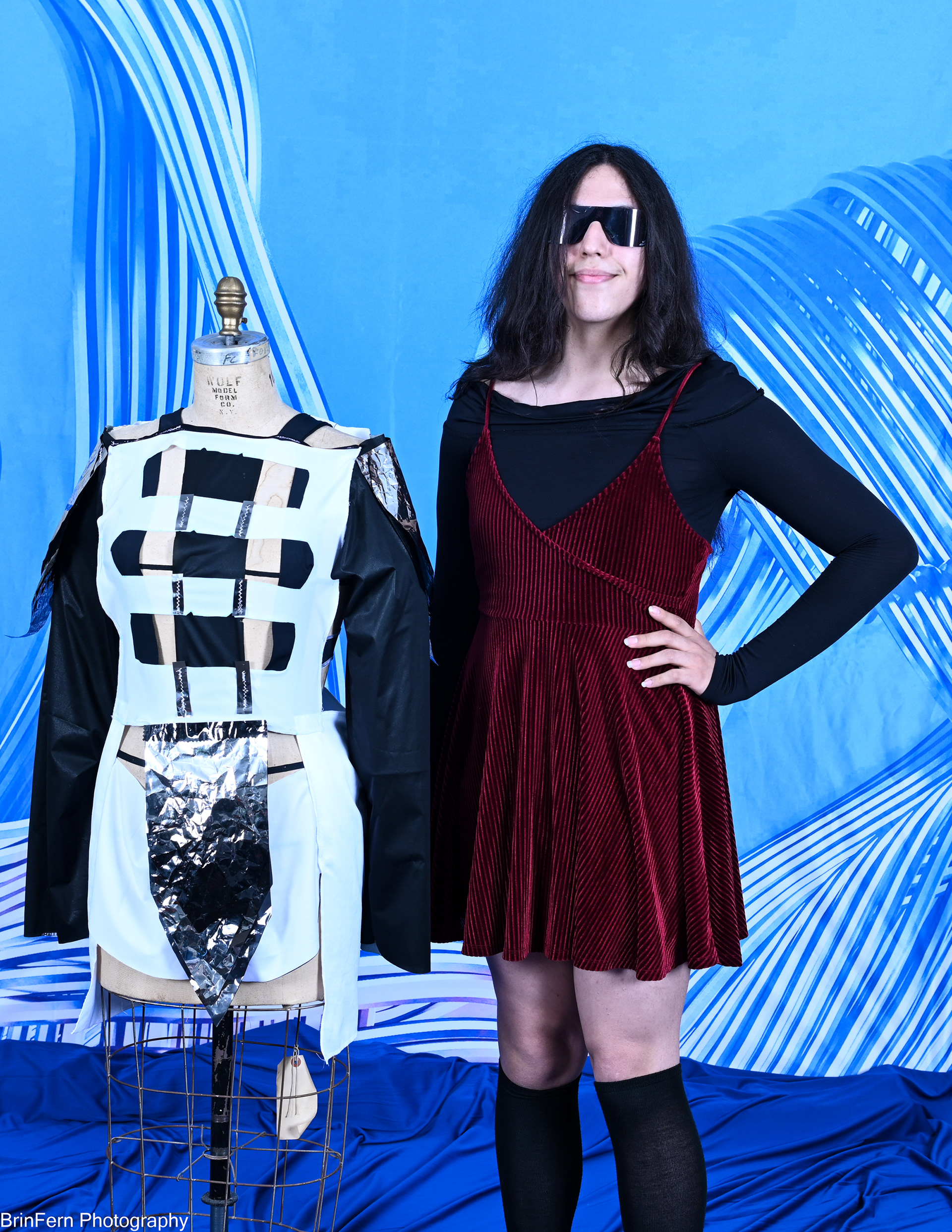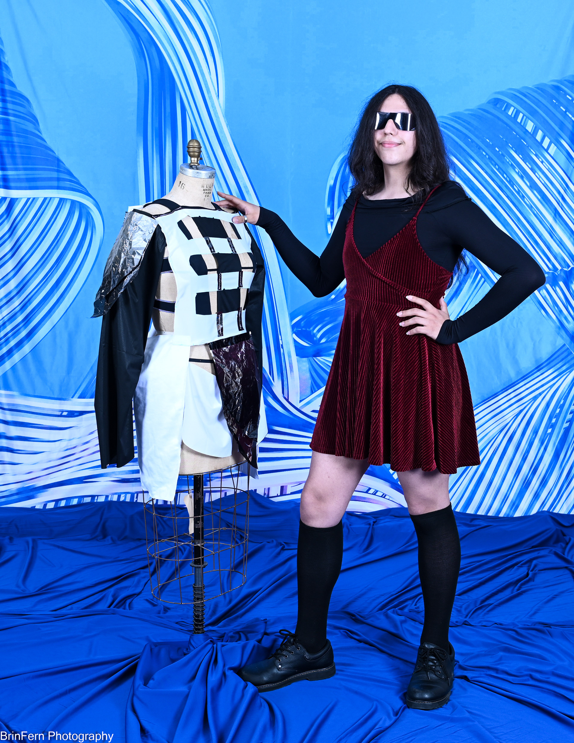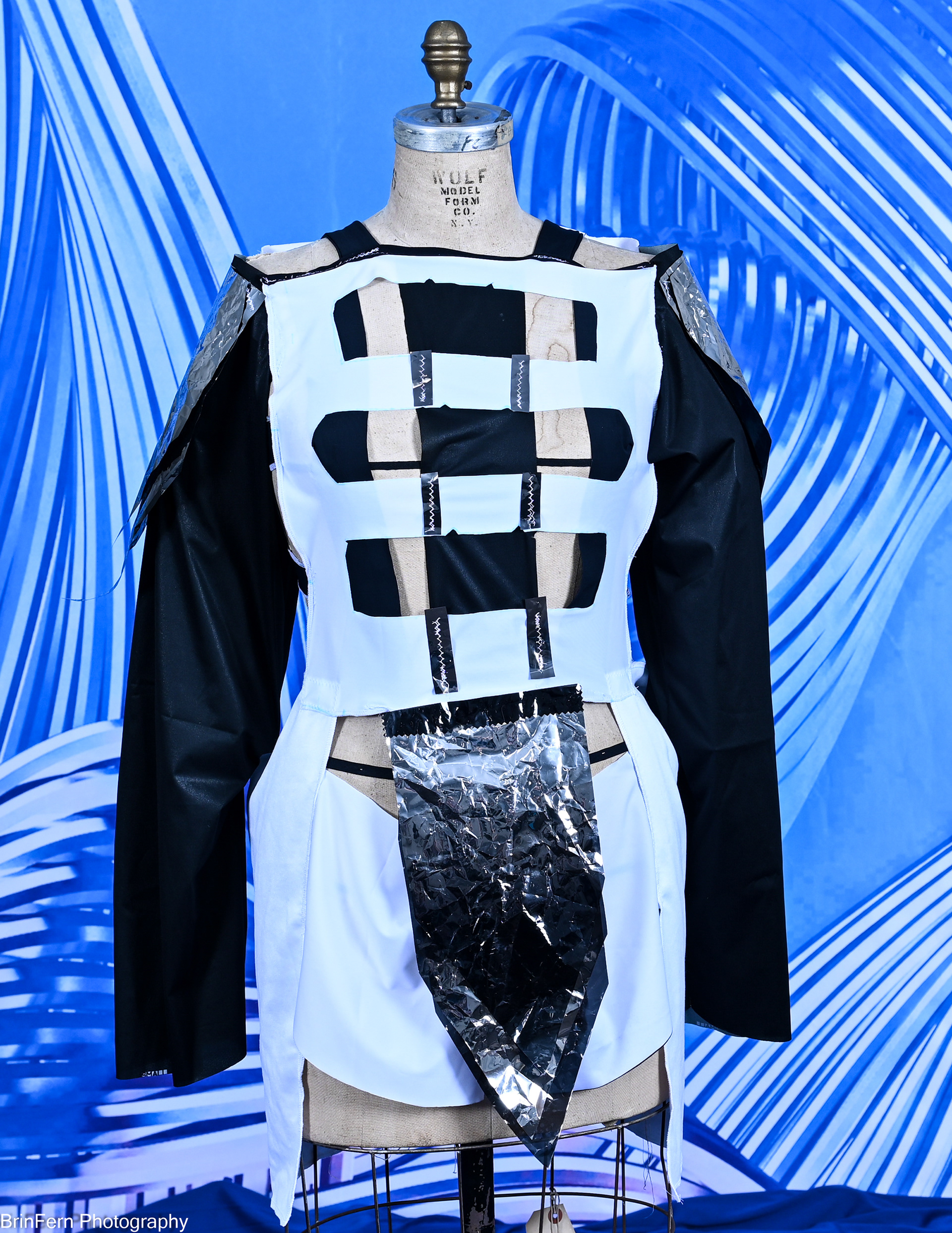 A contemporary outfit that uses mechanical elements in unconventional ways. Using belts, copper wire, electrical tape, duck tape, and led lights, and recycled or discarded fabric.